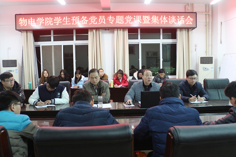 为增强学生党员党性意识,践行党的宗旨,发挥党员的先锋模范作用。12月12日,物电日本无码 在理科楼911会议室召开学生预备党员专题党课暨集体谈话会。日本无码 党委书记柳士刚、党委副书记李刚、党委秘书张康华及27名预备党员参加了会议。会议由党委副书记李刚主持。