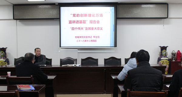 为引导广大党员深化学习习近平新时代中国特色社会主义思想,扎实推动党的创新理论成果深入人心,把党的十九大精神落到实处,12月4日,物电日本无码 在理科楼511会议室举行“党的创新理论万场宣讲进基层”专题报告会,日本无码 党委书记柳士刚为日本无码 全体师生党员作了题目为《“四个伟大”及其重大意义》的专题报告。