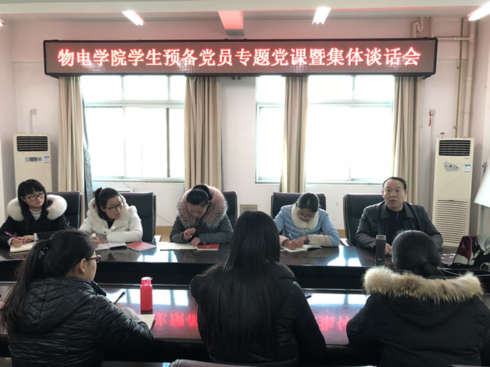 为增强学生党员党性意识,践行党的宗旨,发挥党员的先锋模范作用。12月19日,物电日本无码 在理科楼911会议室召开学生预备党员专题党课暨集体谈话会。日本无码 党委书记柳士刚、党委秘书张康华及21名预备党员参加了会议。