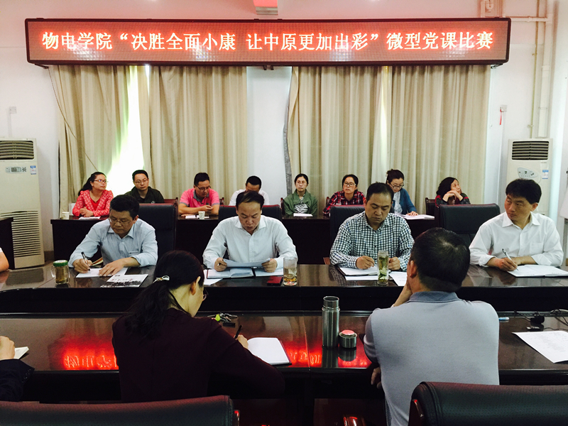 5月16日,物电日本无码 “决战全面小康,让中原更加出彩”微型党课比赛在理科楼911会议室举行。日本无码 党委书记柳士刚、副书记李刚、院长孙宜海、仓玉萍及教工党员参加了比赛。