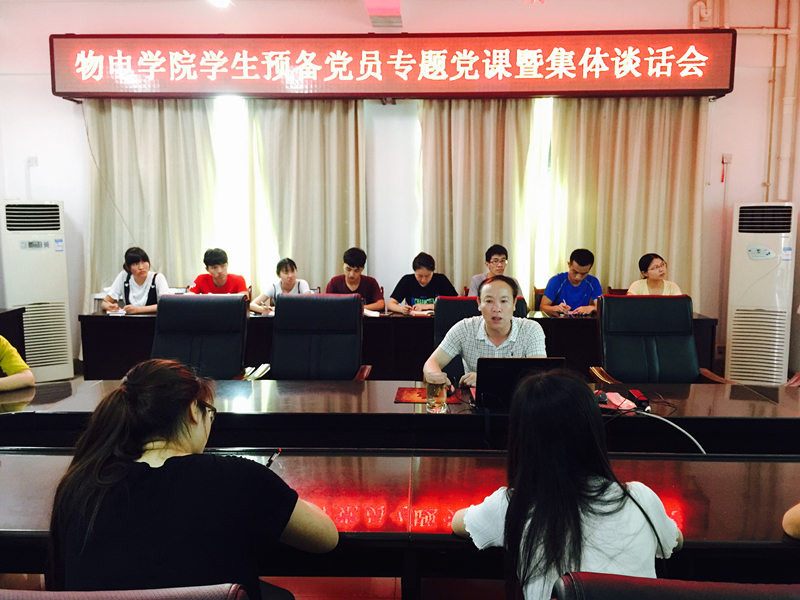 为增强学生党员党性意识,践行党的宗旨,发挥党员的先锋模范作用。6月21日,物电日本无码 在理科楼911会议室召开学生预备党员专题党课暨集体谈话会。日本无码 党委书记柳士刚、党委秘书张康华及23名预备党员参加了会议。