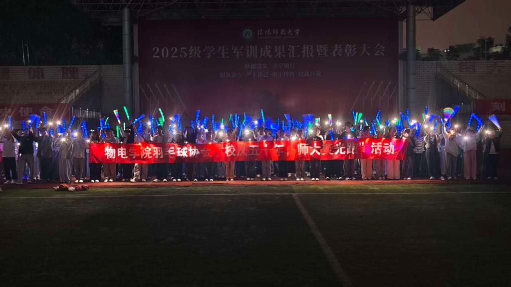 跑道上,哨声响起,同学们手持各色荧光棒,汇成一条璀璨流动的星河。点点荧光如音符般自由跃动,交织出一幅充满生命力的动态画卷。此刻,荧光闪耀,全体学生以青春之名,共同为母校50周年诞辰献上最炽热的祝福。