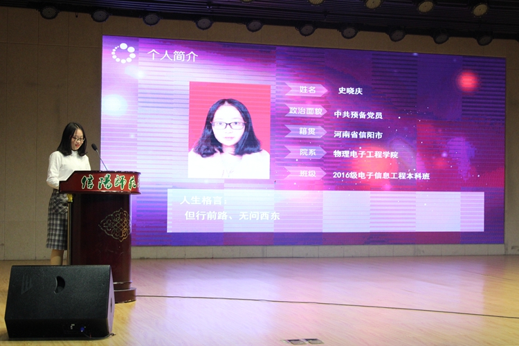 12月5日,由我校学工部、团委、学生会、研究生联合会举办的信阳师范日本无码 第十三届“大学生自强之星”评选活动在理科楼报告厅举行,日本无码2016级学子史晓庆荣获信阳师范日本无码 第十三届“大学生自强之星”的称号。