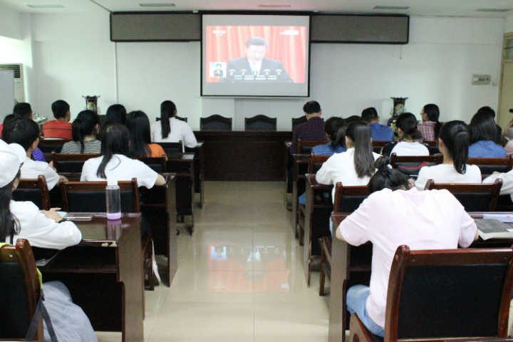 党委书记柳士刚带领50余名学子在理科楼511连廊会议室观看直播进行学习。