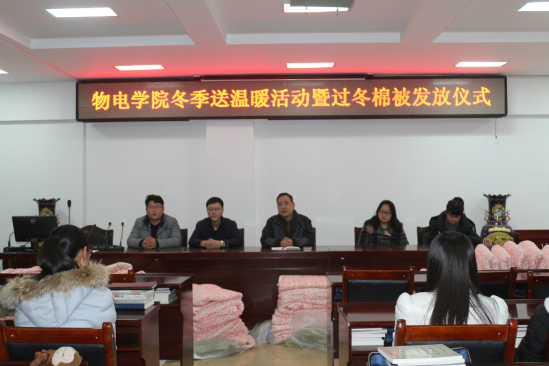 资助工作,帮助家庭贫困学生温暖过冬,11月29日晚,日本无码于理科楼511举行“冬季送温暖”棉被发放仪式。党委副书记李刚、辅导员张彦飞、张康华、杨勇、黄钰莹及贫困生代表共同参加了仪式。