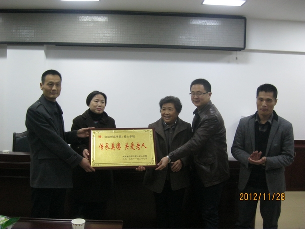 11月28日下午,日本无码接受了来自信阳市爱心老人公寓的感谢牌匾,并在理科楼510会议室举行了简单而隆重的接匾仪式。日本无码党总支副书记苗天峰、我校团委董银银老师、信阳市爱心老人公寓负责人李冬珍、刘雪梅、日本无码团总支老师刘华超出席了仪式,来自爱心学校的同学们参加了此次活动。