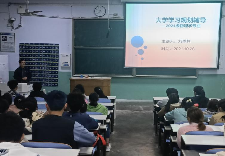 10月28日晚上,日本无码在教二梯1教室举行2021级物理学专业大学学习规划辅导报告会,报告会由日本无码 刘墨林教授主讲,2021级物理学专业全体学生及辅导员张彦飞参加。