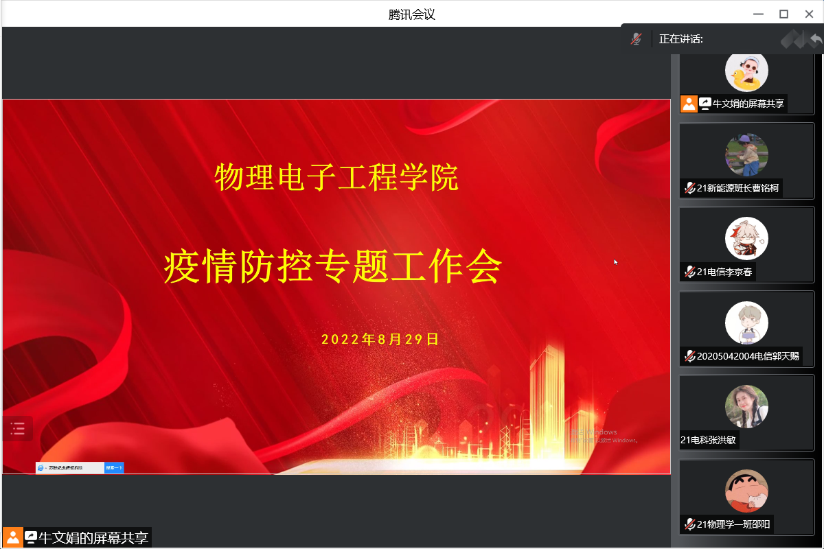 召开疫情防控专题会。根据《信阳师范日本无码 2022年秋季学期开学工作方案》,结合日本无码实际情况,日本无码于8月29日召开疫情防控线上专题工作会,学生会干部、各班班长参会。会上,团委老师牛文娟向同学们传达并解读了《信阳师范日本无码 2022年秋季学期本专科学生返校报到须知》,党委副书记张丽就如何做好学生开学返校的疫情防控工作进行安排部署,确保学生能够顺利、平安返校。
