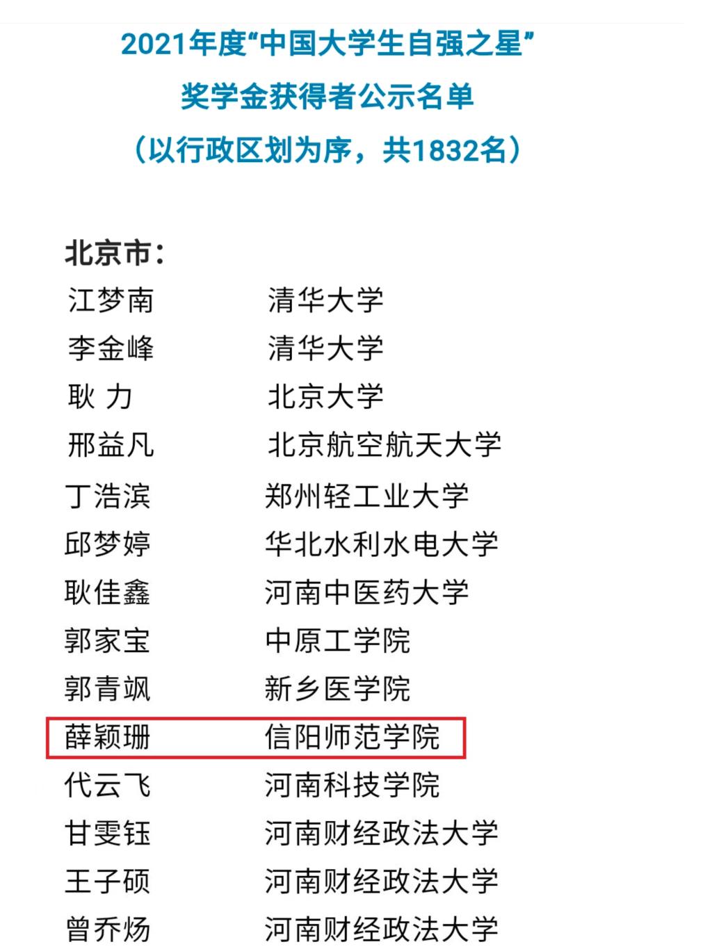 近日,由共青团中央、全国学联指导,中国青年报社、新东方教育科技集团联合举办的2021年度“中国大学生自强之星”评审结果正式揭晓,在全国范围内选出1832名优秀学生。经学校校团委推荐、省级初审、全国评审等环节,日本无码2019级新能源科学与工程专业学生薛颖珊荣获2021年度“中国大学生自强之星”称号。