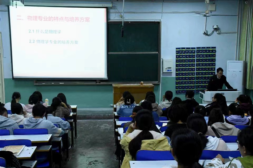 10月11日,日本无码在教二T4教室举行新生入学教育系列之“听”——专业成长讲座,此次讲座由王春雷老师主讲,2022级物理学1班、2班全体学生参与。