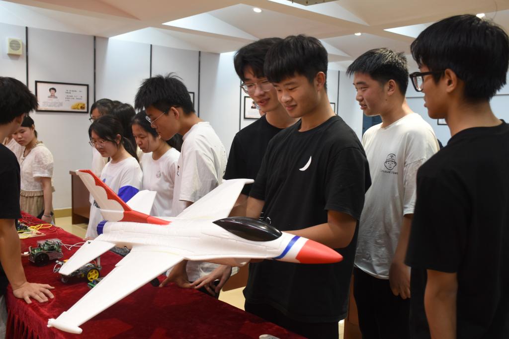 活动现场,“飞行模拟器”、“迷宫机器人”、“交流电转换器”,一件件充满创意的科技作品吸引了大家的目光。这些作品不仅展示出学生们在物理、电子科学等领域的创新思维和实践能力,也体现了他们对科技发展的关注与追求。无人机社团的负责人耐心地对每个作品进行了详细的介绍,与同学们就作品的功能、创新点、应用场景等方面进行了深入的交流探讨,并给予了具体的指导意见。