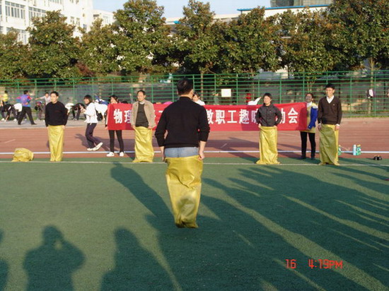 第二项活动袋鼠跳跳在足球场进行,教职工以教研室为单位进行组队,每队由4人组成,每两个队进行比赛,先到达终点者获胜。在比赛过程中,学生们的助威声、呐喊声,声声入耳;教职工之间的相互关心、温馨提醒,情真意切。更可贵的是老教师们的积极参与和认真对待的态度,更是引来大家的一阵阵喝彩声。最终光电教研室队、近代教研室队、力热教研室队和行政队在比赛中获得优胜。
