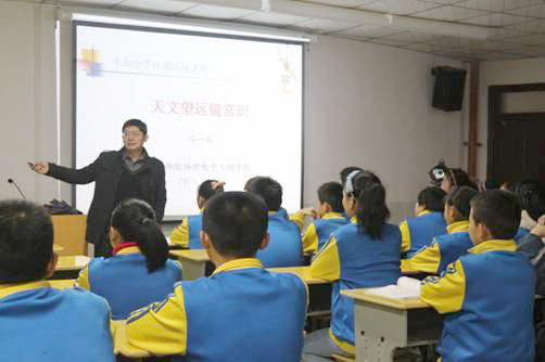 随后,冯老师向该校地理社全体成员作了题为“天文望远镜常识”的讲座。讲座分为“天文望远镜发展简史、天文望远镜的分类、光学天文望远镜的原理以及天文望远镜的使用”四个部分。冯老师以“为什么2009年被联合国教科文组织确定为国际天文年”为引子,并由此展开。首先,冯老师通过生动的故事向同学们讲述了天文望远镜的发明、发展历程。接首,他又以展示大量天文望远镜及天文台图片的方式向同学们介绍了天文望远镜的分类。随后,他结合原理图及现场两台天文望远镜向学生详细阐述了天文望远镜的基本结构、成像原理和使用方法等,在同学们连连称奇中,讲座圆满结束。