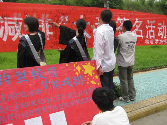5月26日下午,日本无码在桃李园前举办“节能减排”建设节约型校园大型签名活动,路过师生纷纷拿起签字笔在条幅上签名。