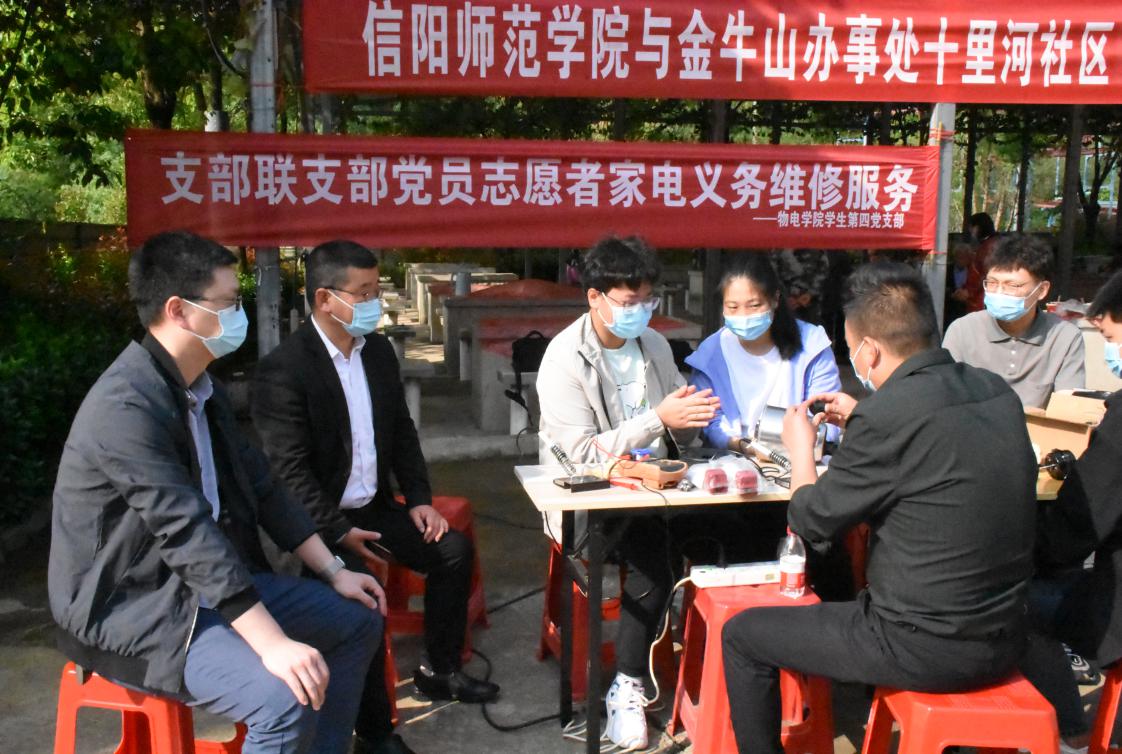为更好发挥支部战斗堡垒作用、提升党员干部能力作风,践行全心全意为人民服务的宗旨,4月23日,物电日本无码 学生党支部与金牛山办事处十里河社区党支部在金牛山文化公园开展“支部联支部”党员志愿者家电义务维修活动。金牛山办事处十里河社区党支部书记张俊峰、物电日本无码 学生第四党支部书记张康华和两个党支部的党员参加了活动。