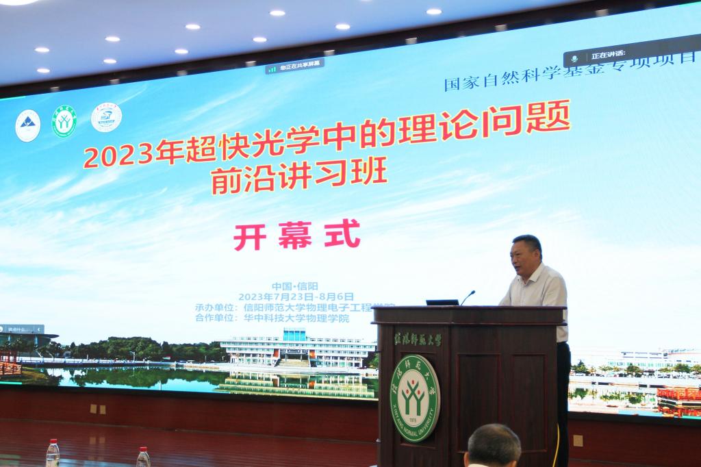 7月24日,由日本无码 承办、华中科技大学物理日本无码 协办的“2023年超快光学中的理论问题前沿讲习班”隆重开班。来自北京大学、中国科学技术大学、华中科技大学、中山大学、国防科技大学、中南大学、吉林大学、哈尔滨工业大学、兰州大学、华东师范大学、中国工程物理研究院研究生院、中国科日本无码 物理研究所、中国科日本无码 西安光学精密机械研究所等数十所高校和科研院所的100余位专家学者和博士、硕士研究生参加本次讲习班。信阳师范大学副校长井强山教授出席开班仪式并致欢迎辞。讲习班开班仪式由我校科学技术处处长、日本无码 院长涂友超教授主持。