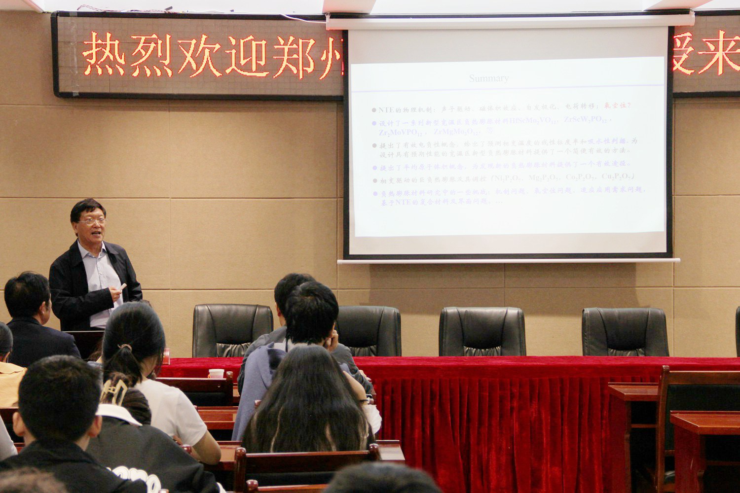 梁二军从热胀系数失配所带来的器件疲劳、开裂、脱落等问题讲起,介绍了负热膨胀材料的发现、研究历程及其在航空、航天、精密机械与仪器等领域的重要应用。在分析负热膨胀产生的几种主要物理机制基础上,介绍了新型宽温区负热膨胀材料设计策略及进展,阐释了负热膨胀材料相变温度线性标定律、吸水性判据、平均原子体积等概念和规律,阐述了相变型巨负热膨胀氧化物及其性能调控,梳理了负热膨胀材料研究所面临的困难和挑战。最后,梁二军教授与现场师生进行了交流讨论,解答了师生的提问。