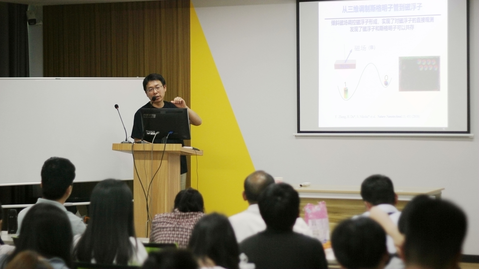 报告会上,杜海峰从强磁场的科学意义出发,首先讲述了数据磁存储的研究背景和发展历程,介绍了磁性斯格明子(Magnetic Skyrmion)是一种纳米级磁性结构,具备手性自旋的特性。然后,展示了材料纳米结构中磁斯格明子的制备方法,并重点讲解了低功耗磁电子学器件结构单元中磁斯格明子电操控,包括磁斯格明子晶体波导、磁斯格明子逻辑门和磁斯格明子存储器。最后总结了拓扑磁结构的探索,指出磁斯格明子器件有望在未来的量子计算和信息存储领域发挥重要作用。报告结束后,杜海峰研究员与在场的师生展开了热烈的讨论,就师生们提出的问题进行了深入、全面的解答。